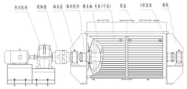 HTM型螺條式混合機結構如圖所示,它有傳動部件、筒體、筒蓋、特殊布置的螺條主軸、出料閥等組成。