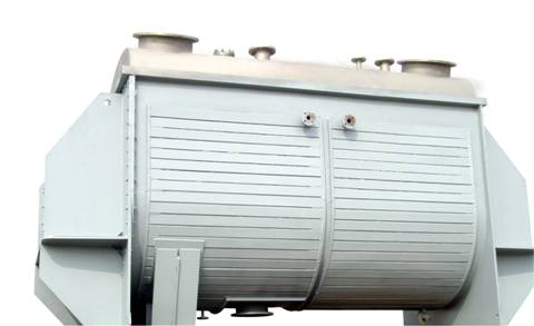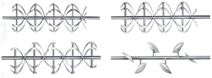 該設備由電機經減速機驅動特殊布置的螺條主軸旋轉,中心出料時外部的螺條將物料移到中心位置,內部的螺條將物料推向兩端板,兩股物料作相互擴散、對流、剪切、錯位和輻射狀運動,從而使物料在極短的時間內達到混合均勻的效果。根據物料特性可選用——連續式螺條、打斷續式螺條和槳葉式螺條。三種螺條根據出料點不同可以排列成中心和端部卸料兩種形式。